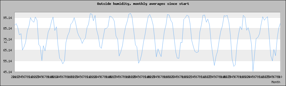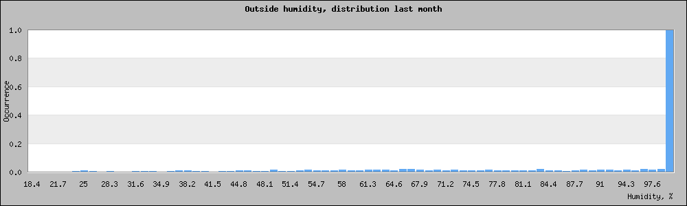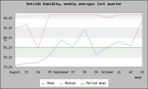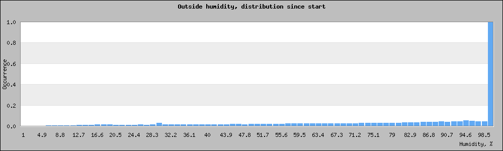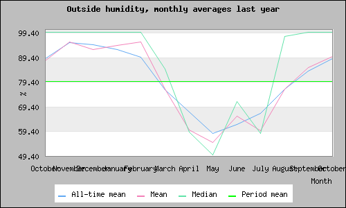 | Outside humidity | 89.92 % | 21.7 %, 2025-10-17 17:00:03 | 99.9 %, 2025-10-01 01:00:02 | 17.83 % |