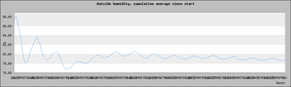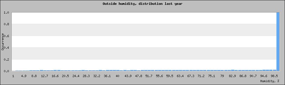 | Outside humidity | 79.26 % | 1 %, 2023-04-14 17:00:05 | 100 %, 2020-09-17 06:00:04 | 25.55 % |