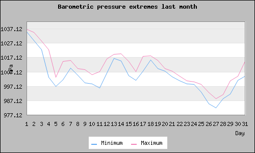 | January | 1005.42 hPa | 961.23 hPa, 2015-01-02 15:30:03 | 1052.21 hPa, 2012-01-29 17:00:05 | 15.16 hPa |