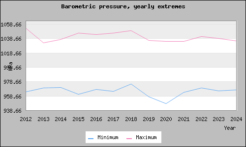 | December | 1003.37 hPa | 958.05 hPa, 2019-12-09 04:30:03 | 1040.6 hPa, 2022-12-02 21:00:04 | 14.07 hPa |