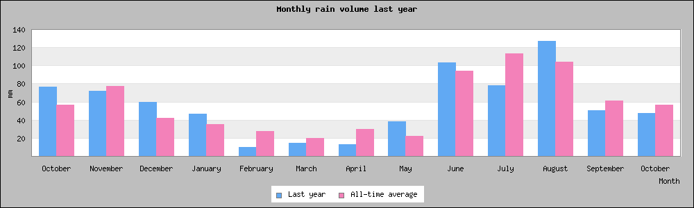 | October | 56.4 mm | 45.46 mm, 2023 | 76.6 mm, 2024 | 2024-10-10, 18.52 mm |